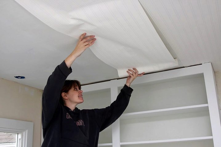 Das Tapezieren schlägt zwei Optionen für nachfolgende Ereignisse vor - mit oder ohne Malen. Die Wahl des Farbtons und der Farbe ist das, worauf Sie achten müssen. Ein zu dunkler Schatten erzeugt eine Atmosphäre einer niedrigen Decke, die auf Sie drückt, und ein heller Schatten erhöht visuell die Höhe des Wohnzimmers. Bei beiden Optionen müssen Sie das vorhandene Reliefmuster auf dem Hintergrund berücksichtigen. Es macht keinen Sinn, Prägetapeten zu kleben, damit sie unter den beeindruckenden Farbschichten verloren gehen.