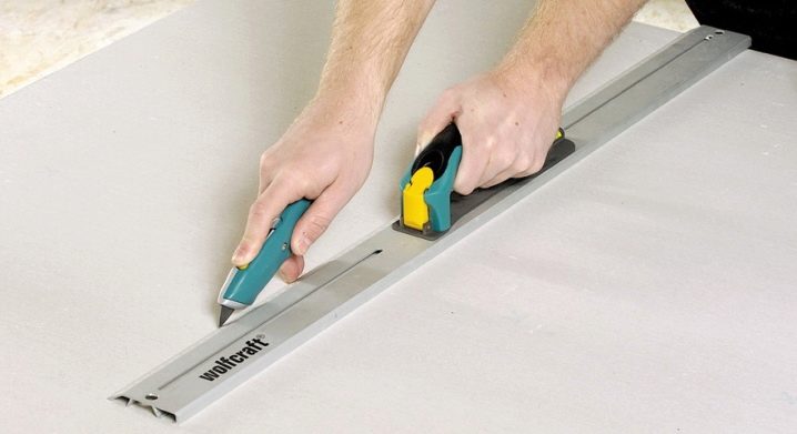 Früher oder später wird es bei der Arbeit mit Trockenbauplatten zu einer Situation kommen, in der das Blech zugeschnitten werden muss. Verwenden Sie hierzu ein Maßband, Lineal und ein scharfes Konstruktionsmesser, das auch geeignet ist. Nachdem Sie die Markierung mit Hilfe eines Messers gemacht haben, schneiden Sie langsam die Kartonschicht ab und versuchen, den Gipsabfüller einzuhaken.Dann legen Sie das Blatt auf den Tischrand und brechen Sie mit einer scharfen Bewegung den Gipsspachtel auf die untere Kartonschicht.