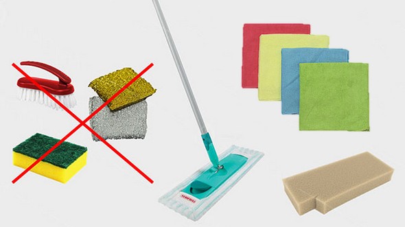 - Sie können nur einen weichen Schwamm verwenden. Harte und harte Gegenstände können die Oberfläche verformen, dh es ist strengstens verboten, Verschmutzungen mit einem Messer, einem scharfen Schaber oder einer Schere zu entfernen, ansonsten müssen Sie die gesamte Beschichtung demontieren. Die Verwendung von Bürsten und Mops birgt auch die Gefahr der Beschädigung der Bahn durch scharfe Borsten und Kanten.