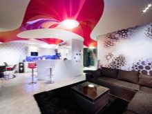 - Wenn Sie Schwierigkeiten haben, sich zu entscheiden und zwei Arten von Texturen im Design verwenden möchten, können Sie sie kombinieren. Dekorieren Sie die Decke mit einer matten Oberfläche, die mit Glanz einen leichten Akzent setzt. Materialien können durch Trockenbau kombiniert werden, indem die Rezeption von verschiedenen Ebenen verwendet wird.