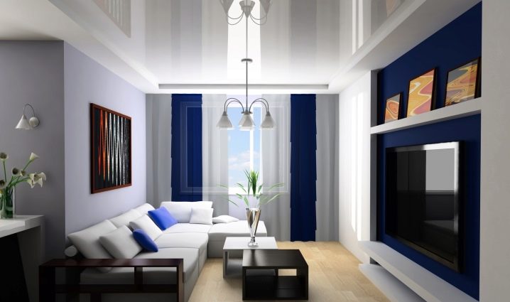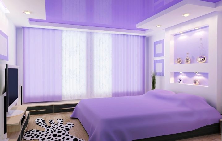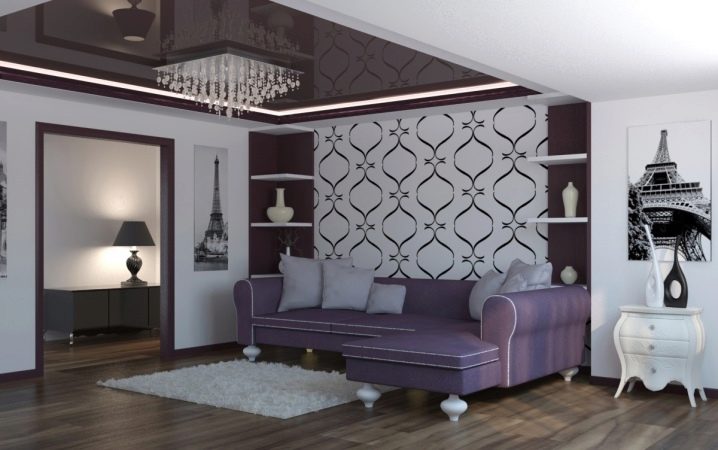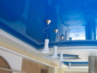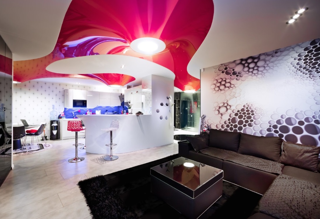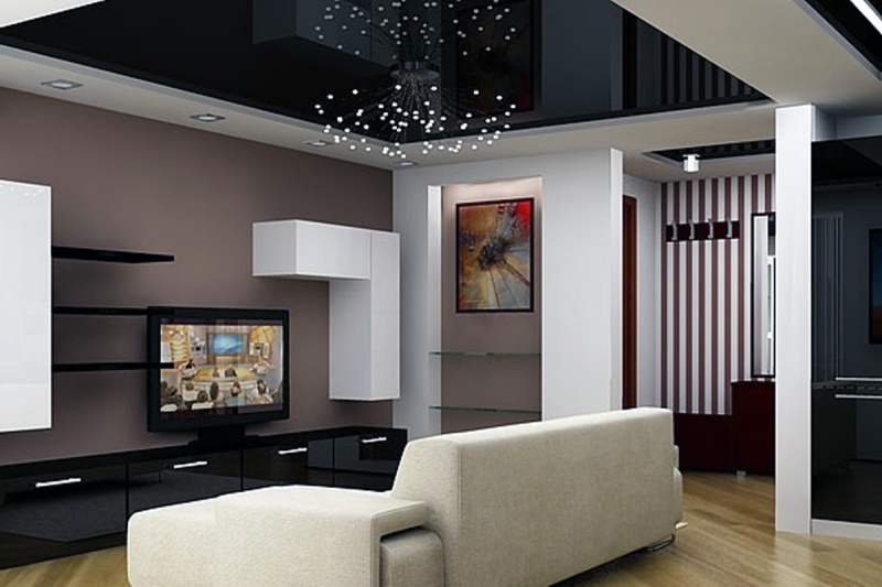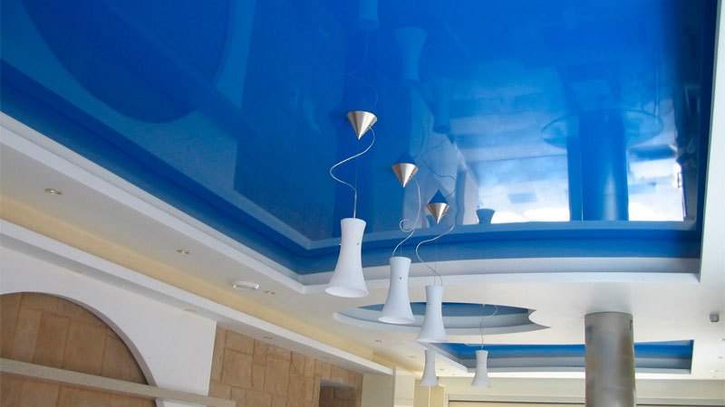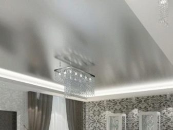 Glänzende Leinwände werden oft verwendet, um moderne Innenräume zu dekorieren. Diese Art von Oberfläche ist reflektierend. Aus diesem Grund kann die Decke den Raum optisch vergrößern, die Wände höher machen und der Raum ist leichter.