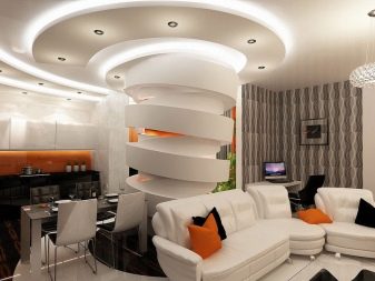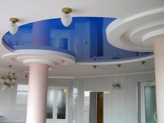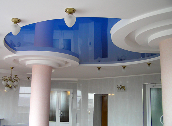 Das Design der Spanndecke ist ein Rahmen, auf dem eine spezielle Art von Material gespannt wird. Die Spannung ist ziemlich starr, und das Material ist gut fixiert, so dass dieses Design sehr ordentlich aussieht. Mit solchen Systemen können Sie absolut jedes Design realisieren, selbst wenn die Decke Öffnungen für Säulen, Hauben oder betont betonte Kommunikationssysteme aufweist.