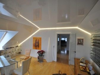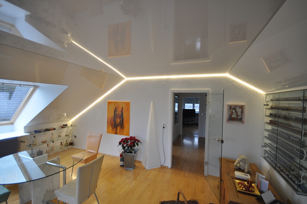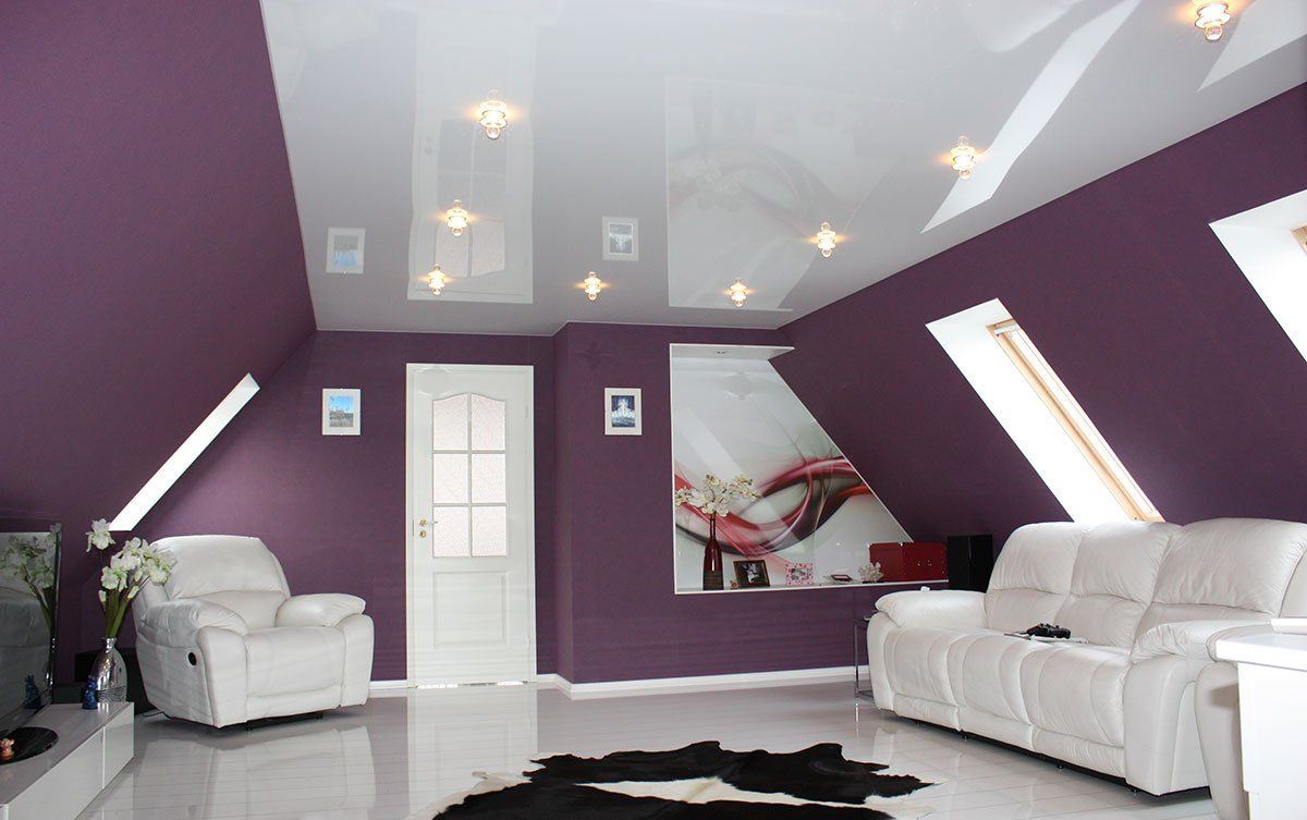 - Die beste Lösung für den Dachboden, wo Spanndecken eine außergewöhnliche Lösung darstellen, ist die Verwendung eines Satinmaterials oder eines matten Films. In diesem Fall sind Ausdrucke unerwünscht. Weiße Farbe hat hier Priorität.