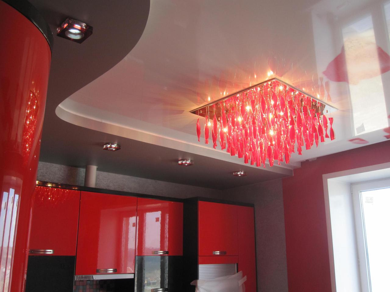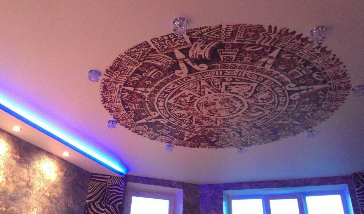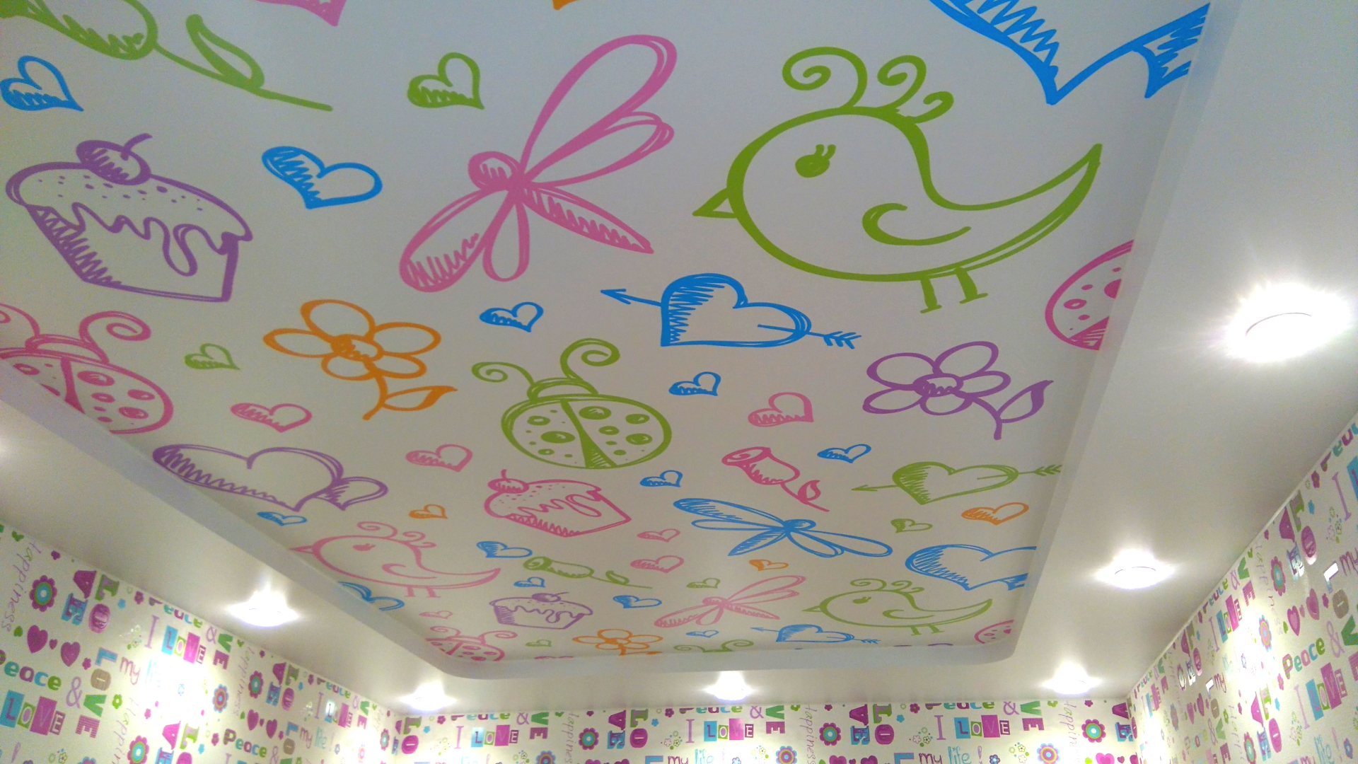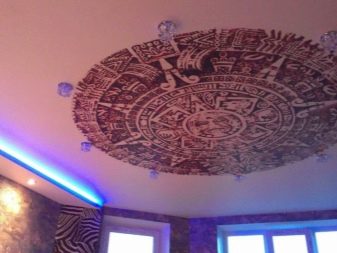 Es ist erwähnenswert, dass die matten Texturen beim Ausdrucken von Fotos mehr Ausdruckskraft haben. In diesem Fall sind die Konturen besonders deutlich sichtbar, was wichtig ist, wenn das Design mit einem Muster gewählt wird. Darüber hinaus können Sie mit dieser Textur jede Art von Beleuchtung verwenden, einschließlich Kronleuchter mit einer Masse von kleinen Lampen. Auf der Oberfläche der Decke wird es keine Blendung geben, die die Augen irritiert, und die Beleuchtungsvorrichtungen werden sehr ausdrucksstark aussehen.