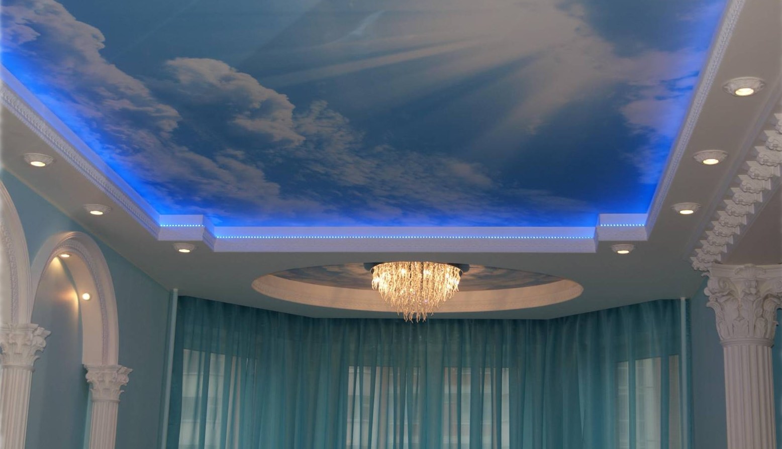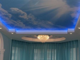 Wer sich für matte Designs entscheidet, spricht über die stilvolle Erscheinung von Gemälden. Besonders beeindruckend ist der Fotodruck mit dem Bild des Himmels und der Wolken, und mit Hilfe einer richtig gewählten Hintergrundbeleuchtung werden die visuellen Grenzen der Deckenüberlappung vollständig gelöscht.