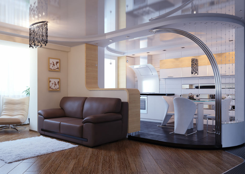 - Für das Wohnzimmer und die Küche können Sie auch glänzende Materialien verwenden.Heute sind sie eine Demonstration des technologischen Interieurs, gut aussehen mit der Unterstützung in Form von glänzenden Beschichtungen von Möbeln oder Accessoires.