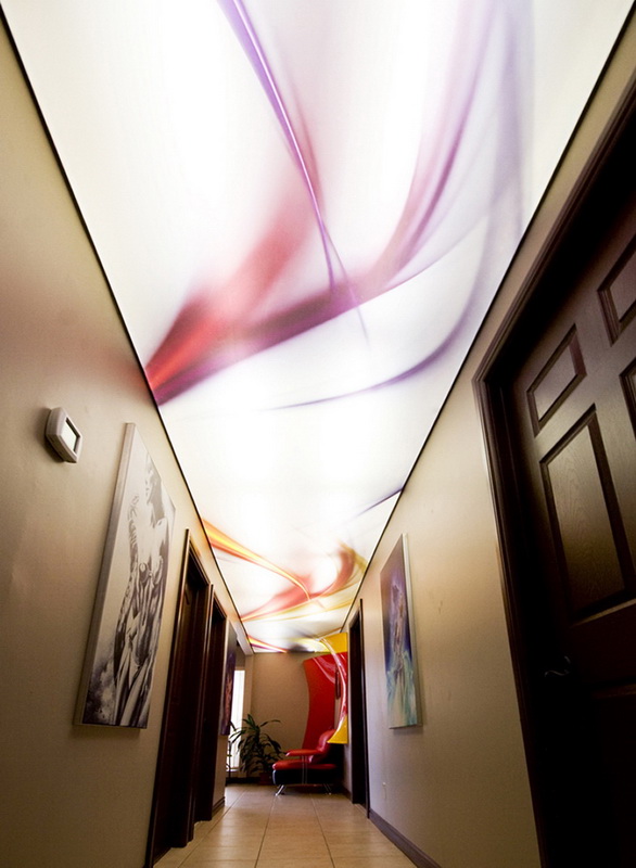 - Alle Spannungsmaterialien sehen sehr schön aus. Sie heben sich vor dem Hintergrund von Deckenfliesen, Wandverkleidungen, Paneelen und anderen Beschichtungen deutlich ab. Sie sind auch in der Lage, die Raumfläche visuell zu verändern.