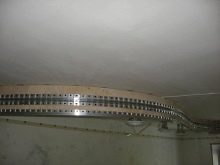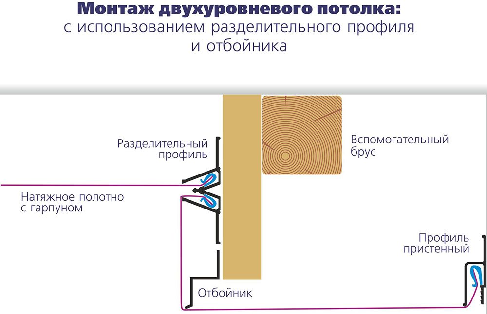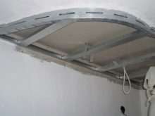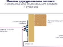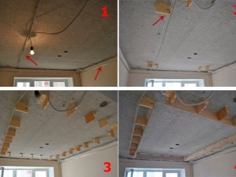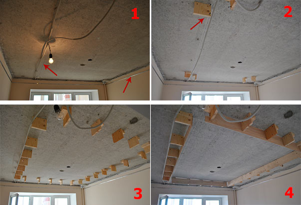 Lassen Sie uns auf den Sperrholzplatten aufhören. Ihre Länge hängt ausschließlich von der Größe des unebenen Teils der unteren Ebene der Decke ab. Seine Breite wird konventionell angegeben, es wird unter Berücksichtigung der Installation von Lampen und einer flachen nativen Oberfläche ausgewählt, so dass der Sperrholzstreifen mit selbstschneidenden Schrauben an den Holzstäben befestigt wird. Der Rahmen unter der Aufzugsebene der Spanndecke ist fertig. Wir kehren zu den Etiketten zurück, die entlang des Umfangs des Raumes gespannt sind. Baguettes für die erste und zweite Leinwand werden hier installiert.
