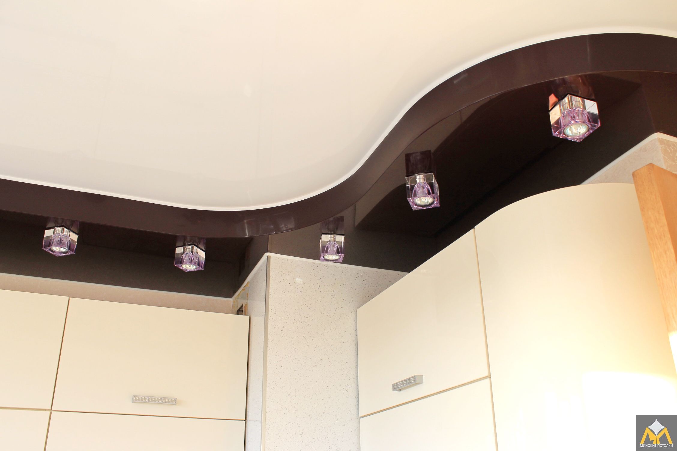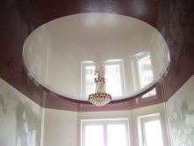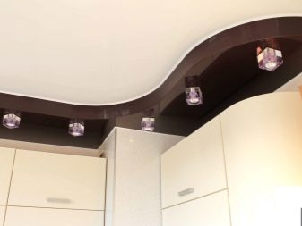 - Eine sehr vorteilhafte Option ist die Kombination von matten und glänzenden Oberflächen. Dieses Design spielt mit speziellen Farben, denn in der Mitte der Decke befindet sich ein matter, beigefarbener Film, umrahmt von einer zweiten dunkelbraunen Farbe mit Beleuchtung mit Strahlern.