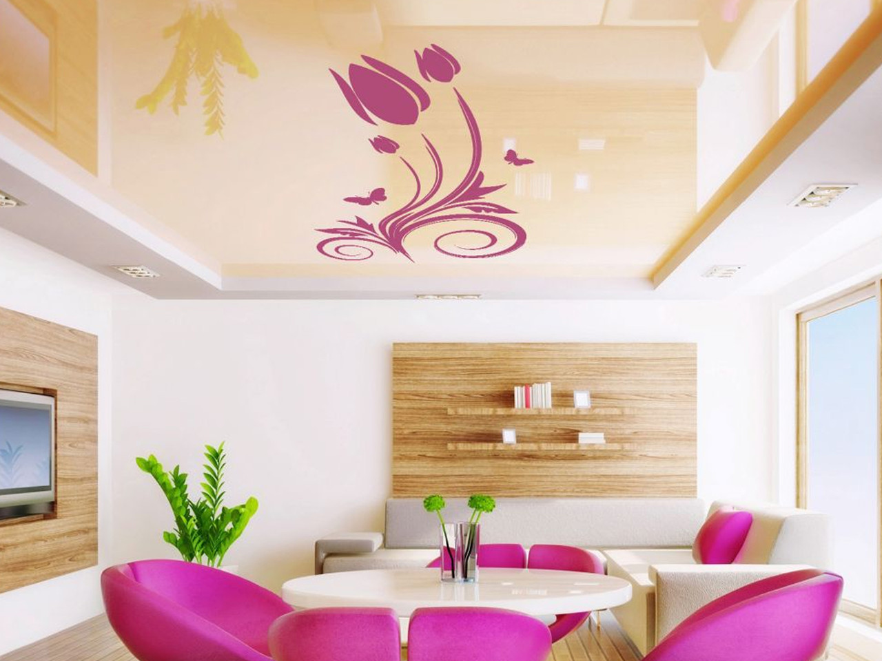 Vinyl Aufkleber für Decken, einschließlich Spanndecken, sind völlig sicher für die menschliche Gesundheit. Daher können sie sicher für das Wohnzimmer, Schlafzimmer oder sogar ein Kinderzimmer ausgewählt werden. Dank dieser Aufkleber wirkt die Decke nicht mehr monoton und uninteressant.