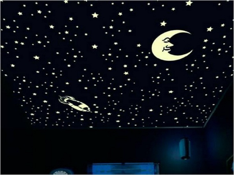 Der Hauptvorteil von fluoreszierenden Aufklebern ist, dass sie den ganzen Tag Licht aufnehmen und nachts in der Dunkelheit angenehm flackern. Diese Option wird in der Regel für Kinderzimmer gewählt, so dass leuchtende Anwendungen das Kinder-Nachtlicht vollständig ersetzen können.