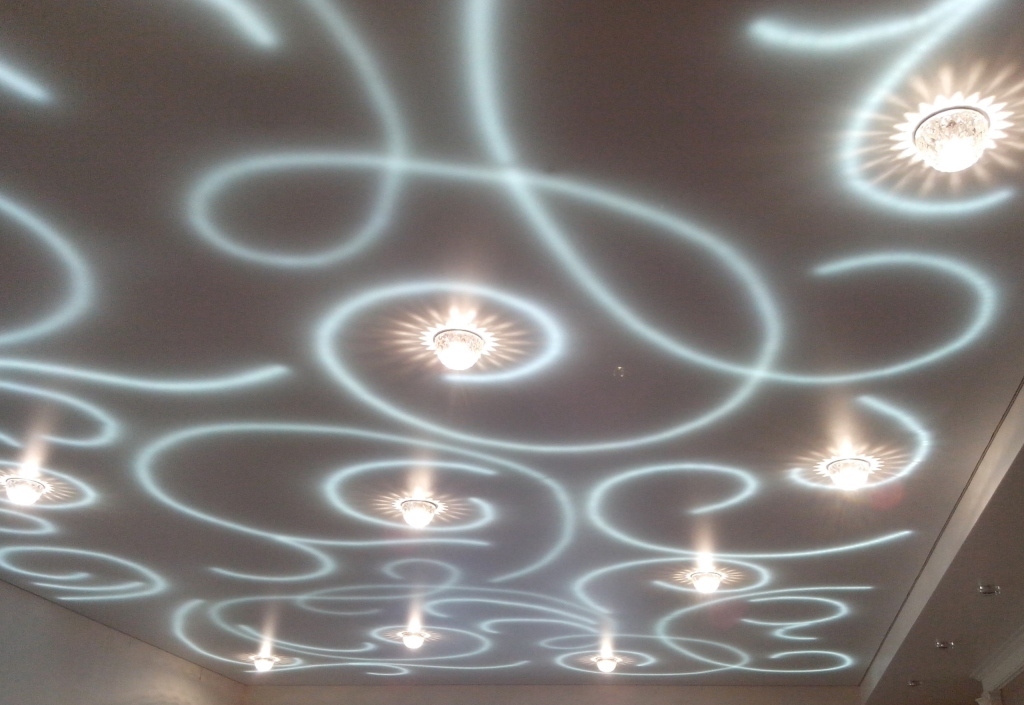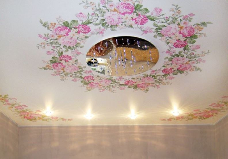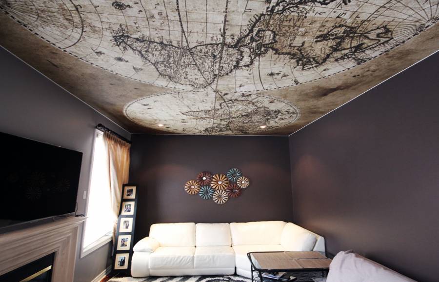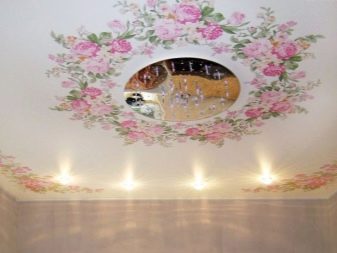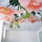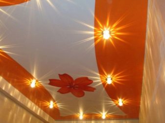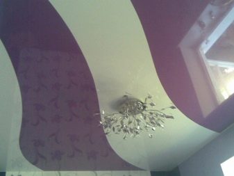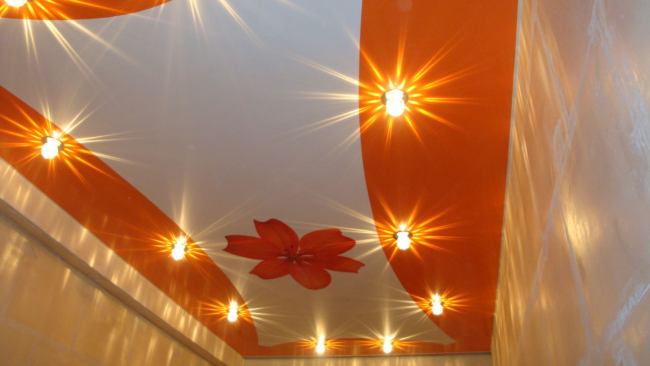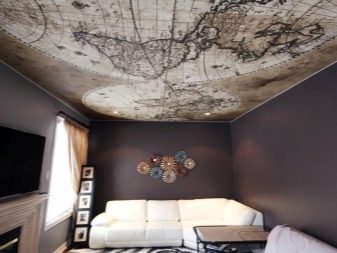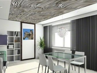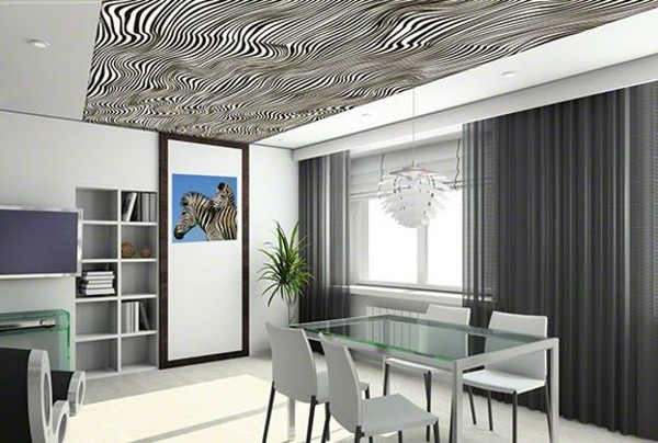 Auch ohne ein stilisiertes Interieur kann die Leinwand der Spanndecke selbst eine dekorative Wirkung erzielen und die ästhetische Erscheinung des Raumes verbessern. Auf dem Markt gibt es viele verschiedene außergewöhnliche Optionen, die in dieser Form durchgeführt werden: