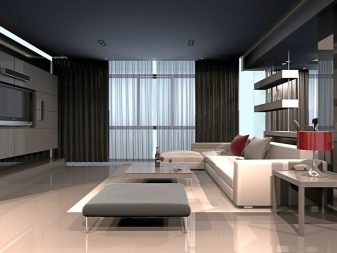 Spanndecken ergänzen die Designlösung im High-Tech-Stil, die sich durch Prägnanz von Linien und Formen auszeichnet,metallischer Glanz der verwendeten Materialien, moderne Ausstattung, die Teil des Dekors ist, und Einfachheit und Zurückhaltung gemeinsamer Elemente.
