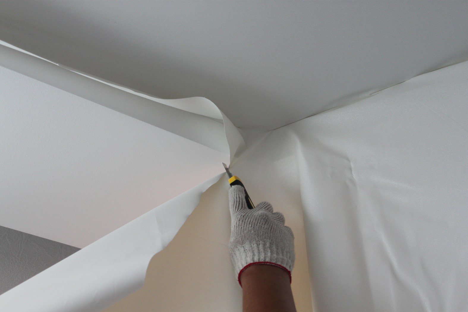 - Leinwand nachfüllen. Stoffe müssen nachgefüllt werden, von den Ecken in die Mitte und PVC - von der Mitte zu den Ecken des Raumes.