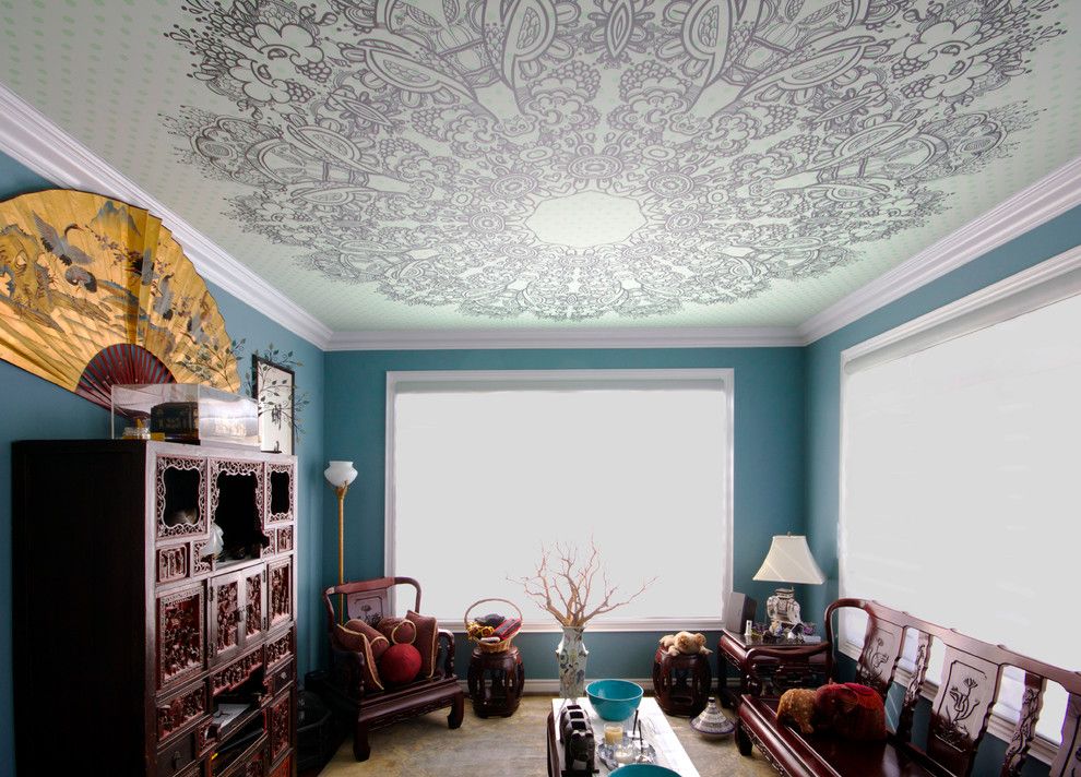 Dieser Stil ist sehr vielfältig - seine Leistung in Bezug auf Farbe und Textur hängt von der gewählten ethnischen Orientierung ab. In diesem Fall unterstreichen einstöckige Spanndecken die gewählte kulturelle Ausrichtung des Designs.