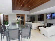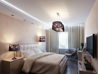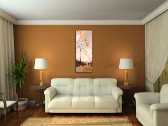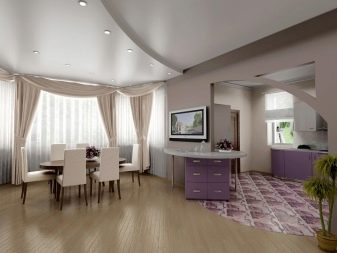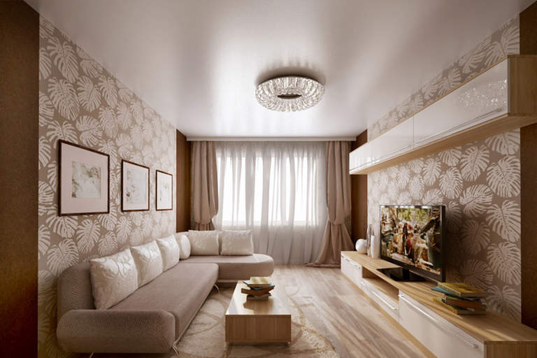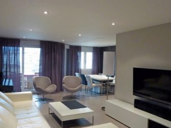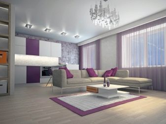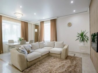 Für ein kleines Wohnzimmer ist es besser, eine einstufige Konstruktion der Spanndecke zu verwenden, die in einem hellen Farbton gehalten ist. Um die einzelnen Bereiche des Gästezimmers hervorzuheben, verwenden Sie Lacke, die in zwei oder mehr Farben lackiert sind. Um den Zoning-Spezialeffekt aufrechtzuerhalten, werden Beleuchtungsvorrichtungen verschiedener Formen installiert. Bei kleinen Raumabmessungen funktioniert eine solche Variante nicht, da in diesem Fall die Decke um 7 cm abfällt.