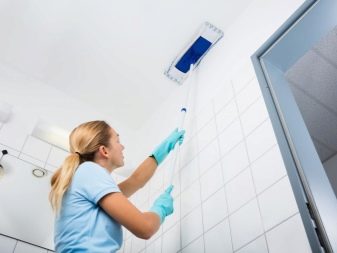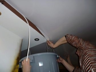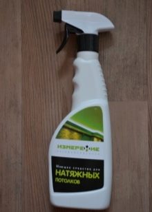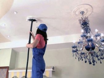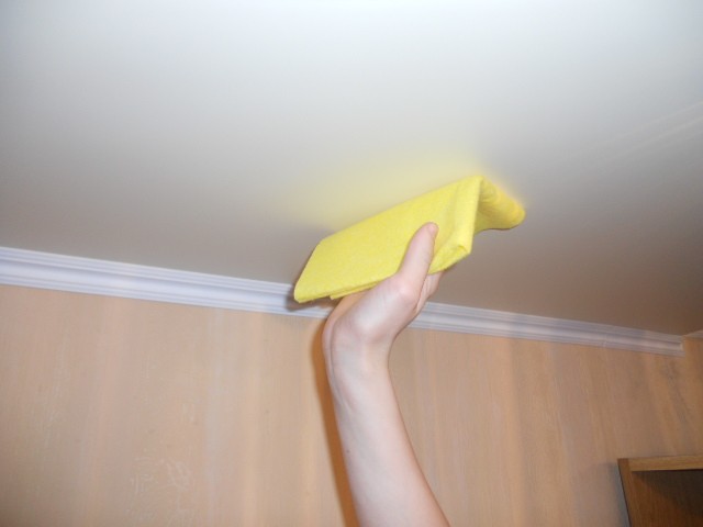 Um Verunreinigungen zu entfernen, müssen Sie ein weiches, in Ammoniak getränktes Tuch auftragen. Die einfachste und billigste Reinigungsmethode ist die Verwendung von gewöhnlicher Seifenlösung oder Geschirrspülmittel. Bevor solche Lösungen jedoch auf die Beschichtung aufgebracht werden, muss sie an einem kleinen unscheinbaren Teil der Decke getestet werden.