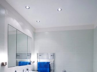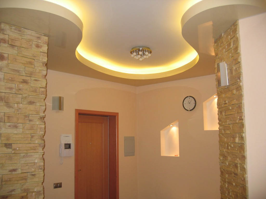 Ein solcher Raum hat normalerweise eine kleine Fläche und ist praktisch unbeleuchtet. Für eine optische Vergrößerung und Geräumigkeit des Raumes wird empfohlen, helle Farben der Deckenverkleidung zu verwenden. Um einen Flickereffekt zu erzeugen, können Sie Spotlights installieren. Für die Höhe der Decke, eine besondere Wirkung des Tages Himmel oder Metallic-Farben der drei Farben: Gold, Bronze und Silber verwendet werden.
