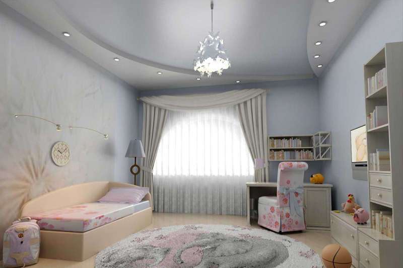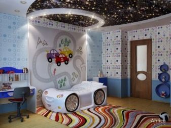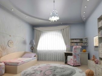 Für ein Kinderzimmer eignen sich Spannsysteme in leuchtenden Farben mit einem gedruckten Bild in Form von Comicfiguren, einem Lieblingshelden eines Films oder eines Märchens. Sie können eine Decke bauen, die Sterne und Planeten darstellen soll. Für ein Mädchen sind zarte Rosatöne geeignet, und für einen Jungen ist es besser, Limette und Türkis zu wählen. Es ist notwendig, das Alter des Kindes und seine Vorlieben zu berücksichtigen.