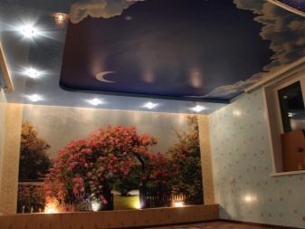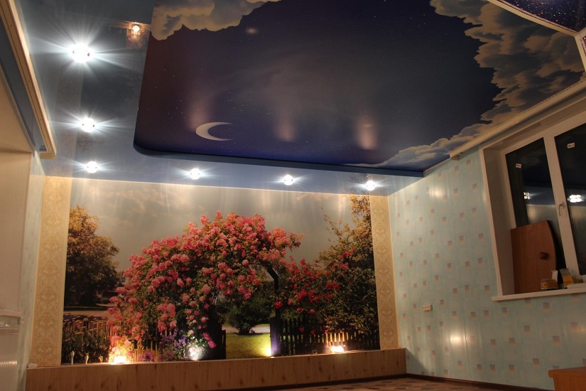 Die ursprüngliche Entscheidung wird die Wahl der hellen Farben sein (rot, koralle, orange, hellgrün). Bei gutem Tageslicht werden solche Beschichtungen matt, bei künstlichem Licht erhält die Leinwand einen Perlglanz. Zusätzlich zur monochromen Färbung können die Spannungsstrukturen verschiedene Muster aufweisen. Die beliebteste Variante der Spanndecke ist die Anwendung des Fotodrucks und die Schaffung des "Sternenhimmel" -Effekts.