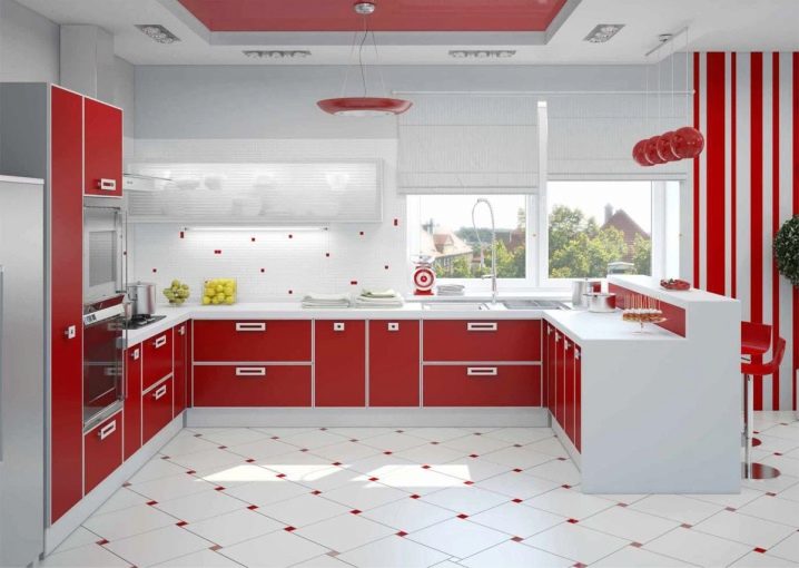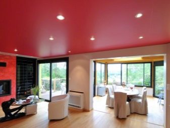 Es wird nicht empfohlen, blaue Farben in der Küche zu verwenden. Es wird angenommen, dass diese Farbe den Appetit reduziert. Für mutige Menschen ist die rote Farbe des Deckenmaterials geeignet, es steigert den Appetit. In diesem Fall müssen Sie ein Küchenset installieren, das der Spanndecke entspricht.