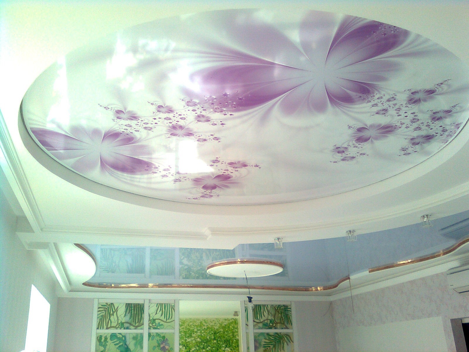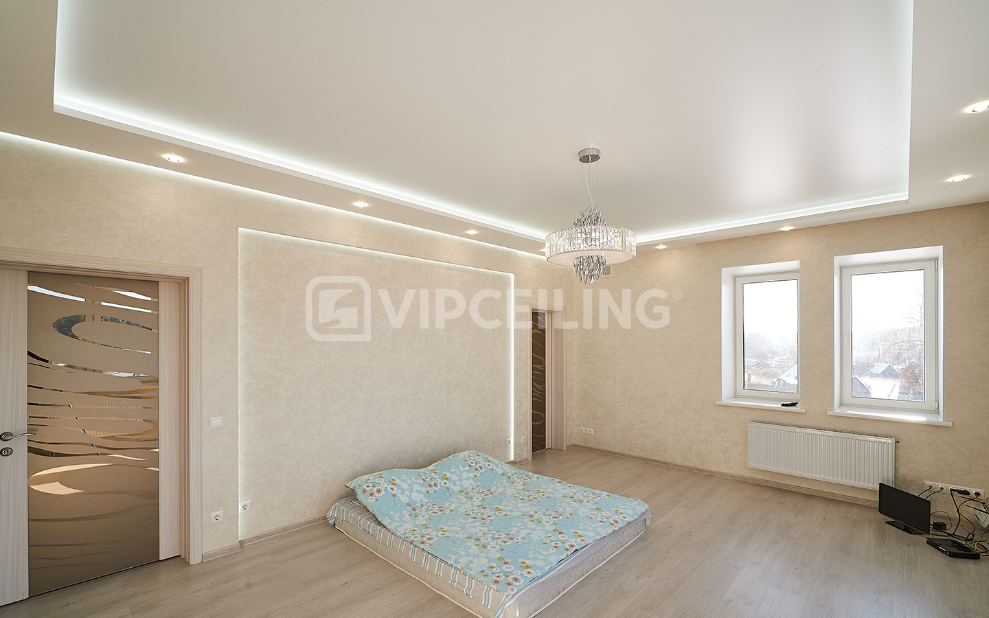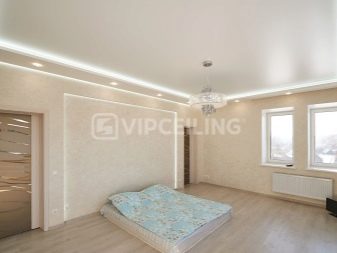 Es gibt verschiedene Variationen von Spannungsstrukturen unter Verwendung von Spannungssatinfolie. Die einfachsten davon sind einstufige Optionen. In ihnen ist der Film über die gesamte Fläche der Decke gespannt. In anderen Fällen ist die Spannplatte ein Einsatz mit einer bestimmten Höhe. Um solche Systeme mit Trockenbau zu erstellen.Mit ihr können Sie die Decke zu etwas Besonderem machen, indem Sie ihr Design mit einem stilvollen Muster aus Stretch-Satin-Folie betonen.