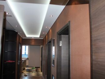 Mit silberfarbenen Beschichtungen können Sie die Höhe der Decke optisch erhöhen. Diese Farbe wird bei der Erstellung von mehrstufigen Strukturen verwendet. Die ideale Variante für den Flur ist ein zweistufiges System mit mehrfarbiger Beleuchtung.