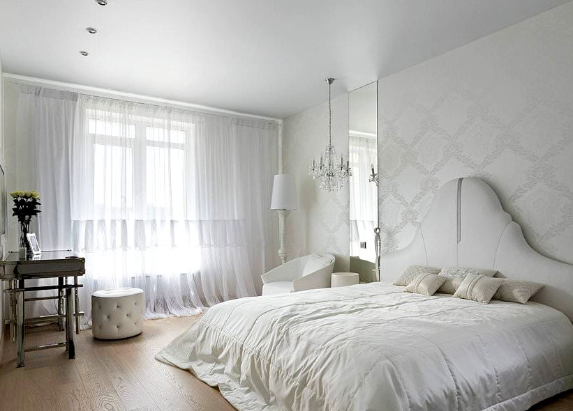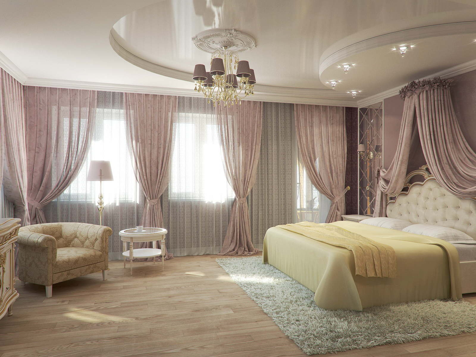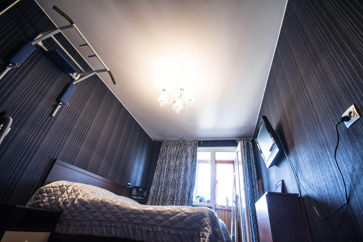Deckenblaue Tönung im Schlafzimmer wirkt beruhigend, es wird in Frieden versetzt. Sie können auf den Spannfilm eine Tönung aus Elfenbein auftragen, die in fast jedes Bild des Innenraums passt. Es wird originell in Kombination mit dunklen Tapeten aussehen.