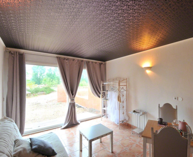 Perlfarben sind nur in Satindecken erhältlich. Dies ist ein weiteres Plus der Satinbeschichtung. Das Hauptmerkmal einer solchen Decke ist eine fragmentarische Reflexion Licht, das zu Innengegenständen führt, wird nicht im Lackfilm reflektiert. Die Verwendung einer matten Spanndecke in einem kleinen Raum hilft, die Höhe der Decke zu reduzieren, mit einer Satinbeschichtung kommt dies nicht vor.