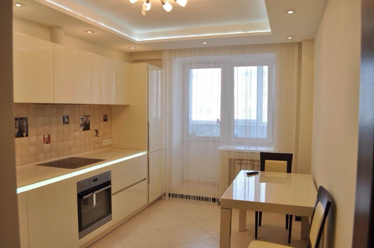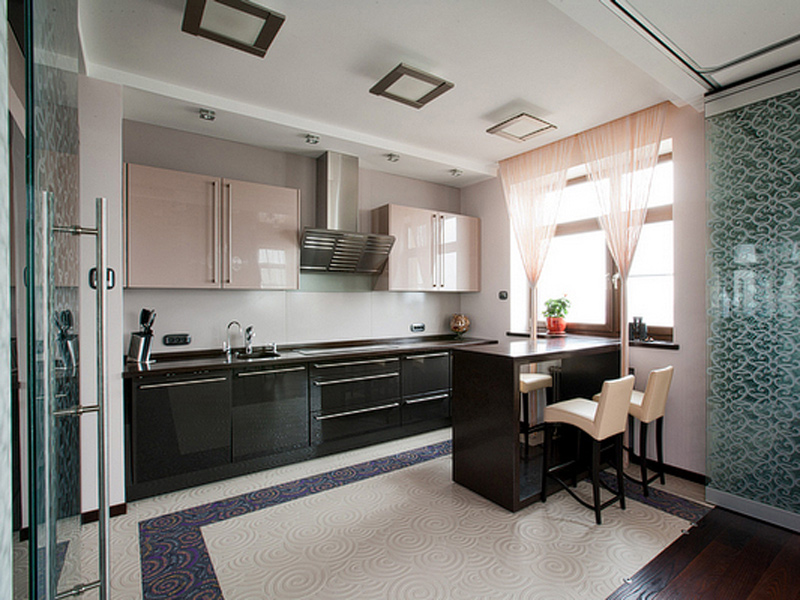 Die Verwendung von Satin-Spanndecken in der Küche hat ihre Vorteile. Helle Farben des Deckenmaterials können den Raum einer kleinen Küche optisch erweitern. Wenn Sie Beleuchtungskörper verschiedener Typen installieren, können Sie den Raum zonieren, den Arbeitsbereich und den Essbereich auswählen.