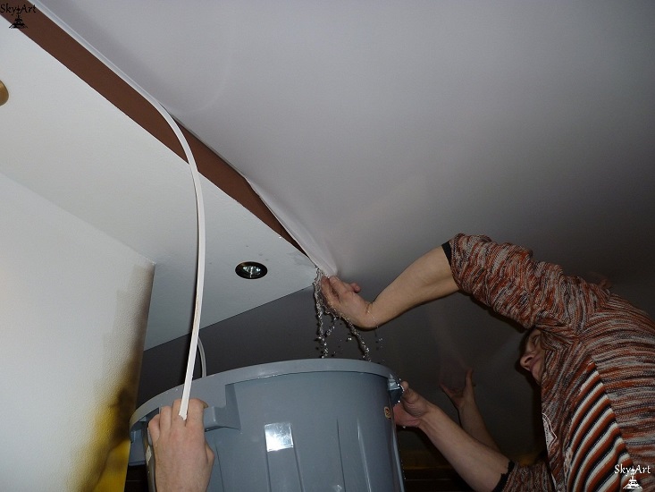 - Satindecken haben eine ausgezeichnete Dampfsperre. Sie lassen keine Feuchtigkeit durch. Wenn die Nachbarn eine Flut in der Wohnung machten, hält Satin die Flüssigkeit sicher bis zu 100 kg pro m2. Gleichzeitig wird das Material gestreckt. Nachdem Sie das Wasser losgeworden sind, nimmt die Beschichtung ihre ursprüngliche Form an.