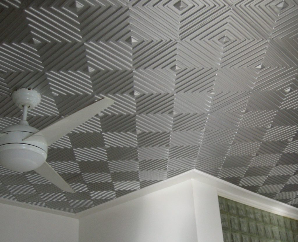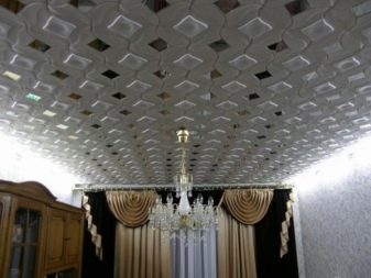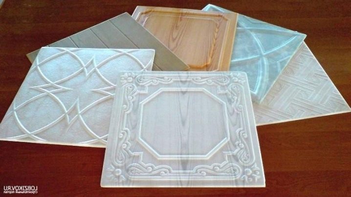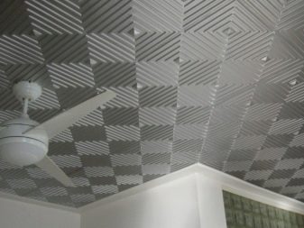 Die Fliese hat in der Regel Abmessungen von 50x50 Zentimetern, was es möglich macht, die Verlegearbeiten selbst mit nur einem Hilfswerkzeug mit einem Minimum an Hilfswerkzeugen durchzuführen. Es ist jedoch nicht nur in quadratischer Form hergestellt, dank der verschiedene Originalmuster an der Decke ausgelegt werden können.
