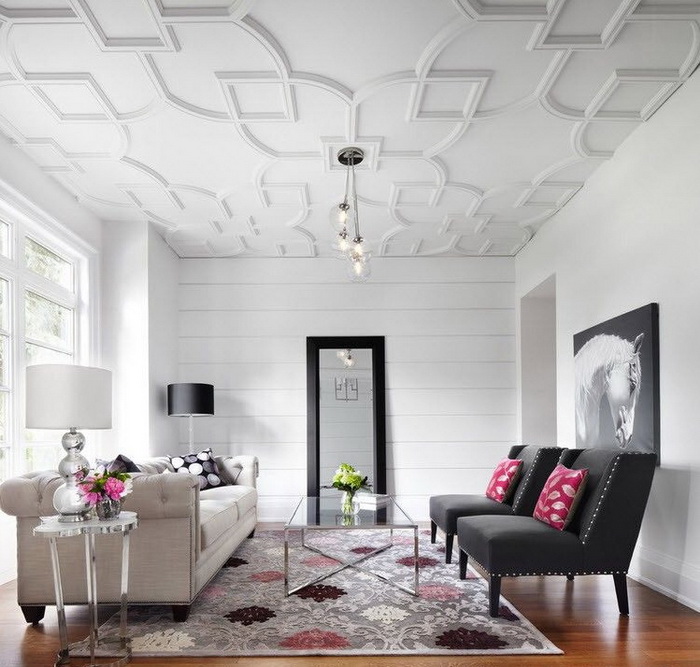 Befürworter klassischer Trends im Interior Design bevorzugen Materialien mit glatter Oberfläche - solche Modelle sind immer relevant. Unter den traditionellen Optionen können Ornamente identifiziert werden, die Wellen des Meeres wiederholen, oder Schach, Diamanten oder Dreiecke gemacht. Auch Blumenarrangements erfreuen sich großer Beliebtheit, denn die Schönheit kleiner Knospen oder großer Blüten kann Kunden von Deckenplatten erobern.