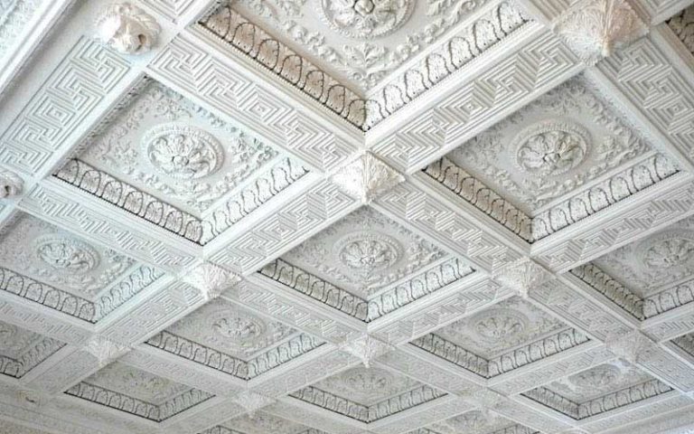 Das ausgeprägte Reliefornament ist perfekt mit Stuckelementen kombiniert. Eine ähnliche Version der nahtlosen Fliesen für die Decke wird eine schicke Dekoration für die Halle oder das Wohnzimmer sein.