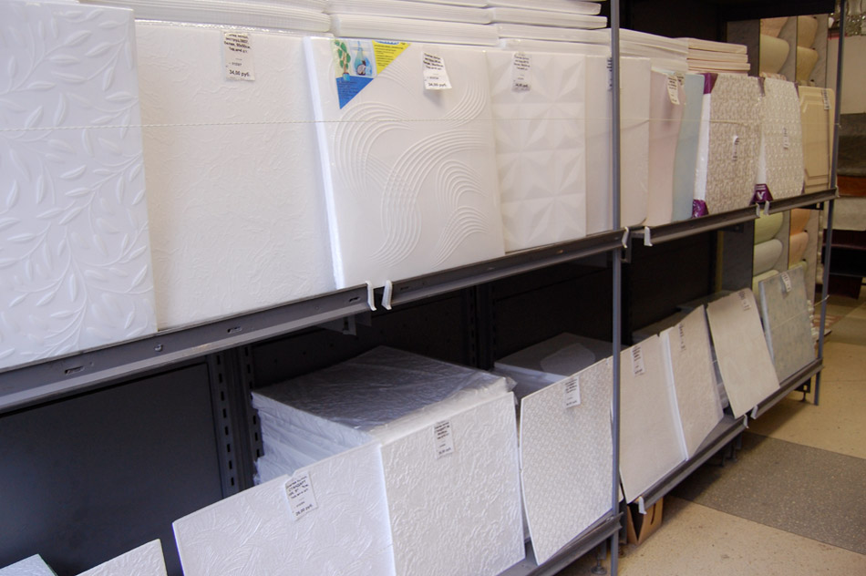 Die Dicke der Elemente variiert im Bereich von 3-15 mm, so dass eine ähnliche Deckenausführung die Raumhöhe im Vergleich zu anderen Bauprodukten, die für die gleichen Bedürfnisse verwendet werden, nicht verringert. Die Installation dauert nicht lange - die Produkte werden einfach und schnell auf die Unterlage geklebt.