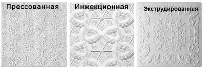 Um solche Produkte zu produzieren, verwenden Sie Polystyrolschaum, der einer gewissen Verarbeitung unterzogen wird, die dem Produkt eine perfekt weiße Oberfläche verleiht. Die Textur der Fliese kann glatt oder mit einem Reliefmuster sein. Eine Vielzahl von Texturen ermöglicht es Ihnen, eine Vielzahl von Optionen für die nicht standardmäßige Dekoration der Deckenfläche in Räumen für verschiedene Zwecke zu implementieren - dies kann eine Küche, ein Wohnzimmer, ein Flur oder ein Bad sein. Produkte imitieren perfekt die Beschaffenheit natürlicher Materialien wie Holzschnitzerei sowie Optionen für Dekorputz und Stuck.