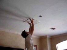 Wenn an der Decke Mängel oder Unregelmäßigkeiten vorhanden sind, wird zum Kleben ein Putz auf Putz verwendet. Außer ihr kleben Sie mit einer Verbindung namens Knauf an der unebenen Decke. Es ist für Höhenunterschiede von 5 mm geeignet. Bei großen Defekten sollte die Decke zuerst ausgerichtet werden.