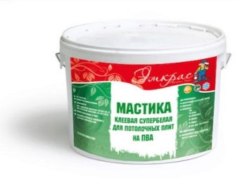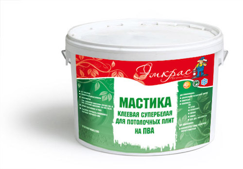 Zum Verkleben von Deckenplatten Verwenden Sie oft spezielle Mastix. Es wird in Eimern verkauft und hat eine pastöse Textur. Dieser Kleber ist viel einfacher zu verwenden, weil er flexibel ist: Jedes Element der Beschichtung wird sofort an der Decke befestigt, es muss nicht für lange Zeit gehalten werden. Mastix- und Fliesenkleber wird nur für Decken mit einer glatten Oberfläche verwendet.