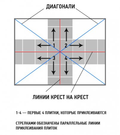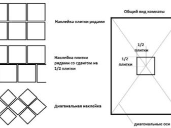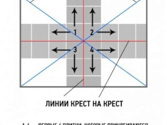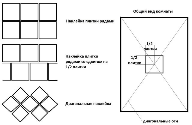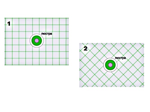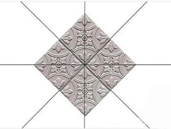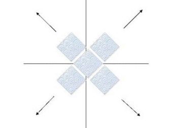 Die diagonale Platzierung der Fliesen (Diamant) wirkt optisch ansprechender. Die Nähte bei dieser Installation sind fast unsichtbar.. Die diagonale Verlegung der Fliesen muss vom Kronleuchter aus erfolgen. Es ist wichtig, die Korrektheit der Installation zu kontrollieren, so dass alle Platten genau den Linien folgen.