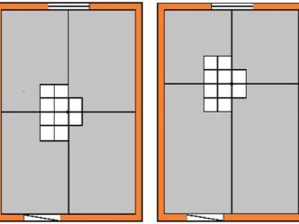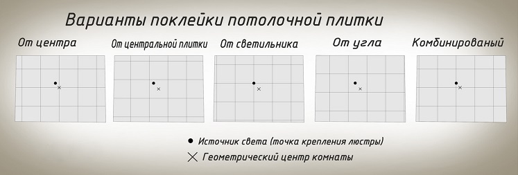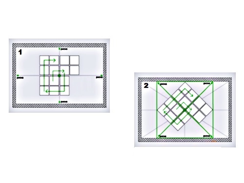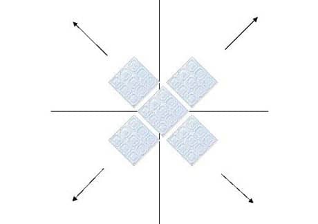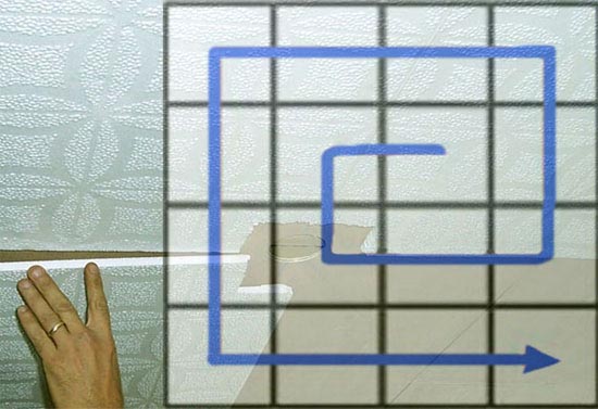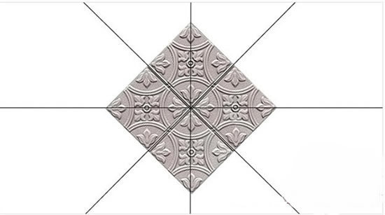 Es besteht darin, Fliesen in Reihen dicht aneinander entlang der Wände zu platzieren. Stickender Anfang vom zentralen Teil. Diese Lösung wird verwendet, wenn nahtlose Fliesen für die Decke verwendet werden. Indem Sie Fliesen nach dem klassischen Schema kleben, können Sie eine komplette Fläche erstellen.