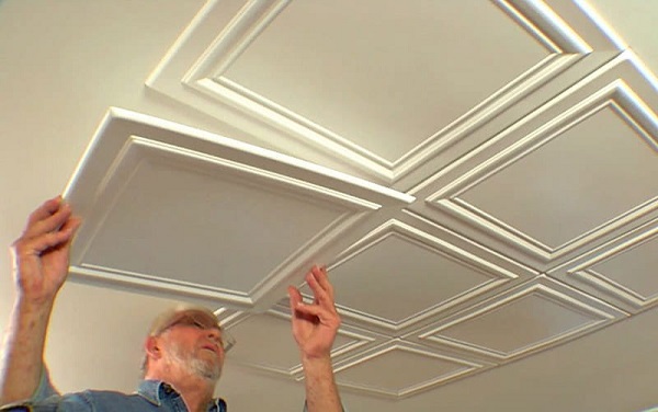 Weiteres Kleben ist vereinfacht. Jede nächste Kachel muss deutlich an der Kante des bereits an der Decke befestigten Elements befestigt werden. Wenn sich Muster auf der Oberfläche der Platte befinden, müssen sie kombiniert und korrekt verbunden werden.. Zuerst müssen Sie das Muster anpassen und dann den Rest der Platte einfügen. Das Andocken sollte vollkommen flach sein.