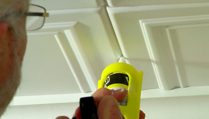 Beim Kleben schafft es nicht jeder, die Nähte zwischen den Elementen der Deckenverkleidungen vom ersten Mal zu bekommen. Oft kann es eine Lücke zwischen ihnen geben. Wenn im Laufe der Arbeit kleine Lücken entstanden sind, können diese nach dem Verlegen der Fliesen mit einer weißen Acrylversiegelung bedeckt werden. Es muss vorsichtig in den Schlitz gedrückt werden, so dass es sie füllt. Danach müssen Sie überschüssigen Klebstoff loswerden.
