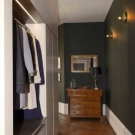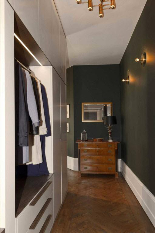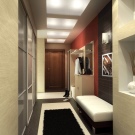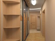 Wenn Sie in einem solchen Flur einen Kleiderschrank platzieren möchten, sollten Sie einen Schrank mit Schiebetüren bevorzugen: Für Pendeltüren brauchen Sie mehr Platz. In einem engen Flur ist ein Schrank mit einer Breite von 45 cm angebracht, dessen Schiebetüren mit einem Hauch von Wänden farblich übereinstimmen oder verspiegelt sein sollen. Wenn ein schmaler und langer Korridor in einer Sackgasse endet, können Sie keinen Spiegel gegenüber dem Eingang platzieren: das wird den Raum optisch noch mehr verlängern.