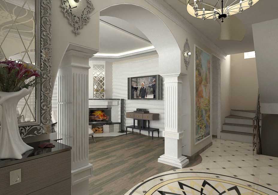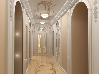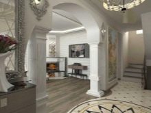 Bögen eines beliebigen Designs sind im Falle eines Korridorausgangs zu einem Salon unersetzlich. So sind zwei Zimmer im selben Stil eingerichtet. Wenn der Flur auch die Funktion eines Flurs hat, der mit dem Wohnzimmer kombiniert wird, kann man nicht auf Verzierungselemente (Bögen, Säulen, Wandnischen, Leisten) verzichten.In diesem Fall ist es angemessen, mehrstufige Decken mit separater Beleuchtung für jede Ebene zu entwerfen.