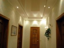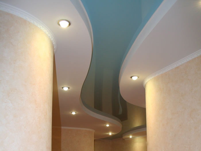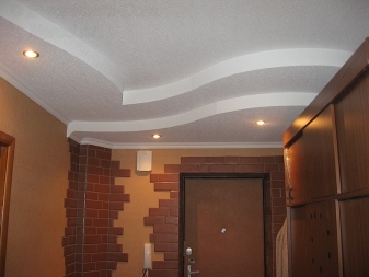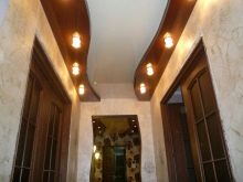 Die traditionelle Technik ist die Verwendung von abgehängten Gipskartondecken. Sie können in mehreren Ebenen durchgeführt werden. Wenn es notwendig ist, einen Korridor zu zonieren, wird die Hintergrundbeleuchtung jeder Ebene mit Zugang zu einem separaten Schalter installiert.Sie können also nur die aktuell genutzte Zone abdecken.