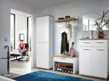 In einem geräumigen Zimmer sind die Auswahlmöglichkeiten nicht begrenzt, Sie können andere Möbel zum Grundminimum hinzufügen. Es sollte kompakt und funktional sein. Der Schrank ist vorzuziehen, den eingebauten Typ mit Fachtüren zu wählen, der Hocker - mit einer internen Schublade für die notwendigen Details. Die Bank ist schmal, um den Raum nicht zu überladen. Anstelle eines Wandhängers für Kleidung ist es besser, einen runden Kleiderbügel an einer vertikalen Stange zu installieren: er ist geräumig, braucht wenig Platz, hat zusätzliche Haken für Taschen und Regenschirme. Bei Bedarf ist es einfach, sich tief in den Raum zu bewegen.