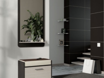 Es ist zweckmäßiger, einen Wandspiegel über dem Schrank für Schuhe anzuordnen, in dem ein Aufbewahrungsort für Schuhe, Kleider- und Schuhbürsten, Kämme, Schlüssel, Regenschirme aufbewahrt werden kann. Die Möbel sollten harmonisch und teuer aussehen: Es ist besser, ein Holzsortiment zu wählen. Es ist praktisch, zuverlässig und langlebig.