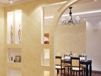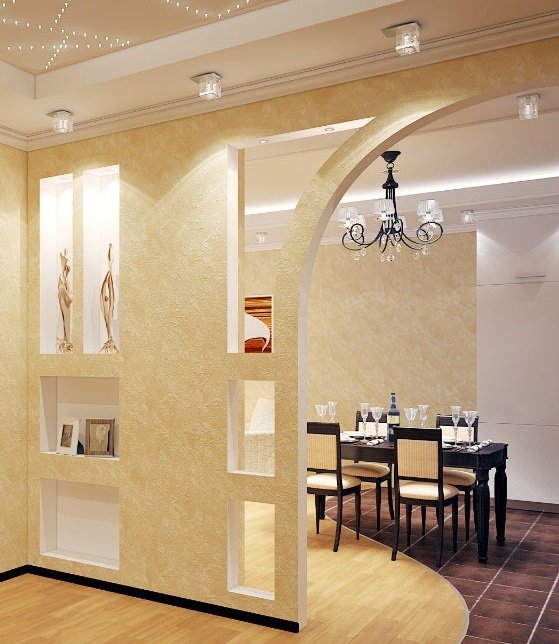 - es ist zweckmäßiger, Bögen oder Nischen zu verwenden, um in die Zone des Eingangs in öffentliche Räume (Küche, Esszimmer, Wohnzimmer) und mehr Kammer (Schlafzimmer, Kinderzimmer, Arbeitszimmer, Heimbibliothek) zu teilen.