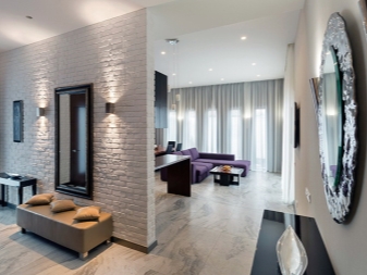 Ein Funktionsbereich von einem anderen kann Wanddekoration sein. Im Flur sind die Wände mit Natur- oder Kunststein verkleidet, alle anderen Teile der Wände sind zum Bemalen entfernt oder mit Tapeten ähnlich dem Material der Wohnzimmerwände verkleidet. Functional Zoning ermöglicht es Ihnen, Ordnung zu halten. Wenn es keine klare Verteilung gibt, können sich Outdoor-Kleidung und Schuhe aus dem Eingangsbereich entlang des gesamten Korridors bewegen und oft einen Teil des Wohnzimmers erfassen.