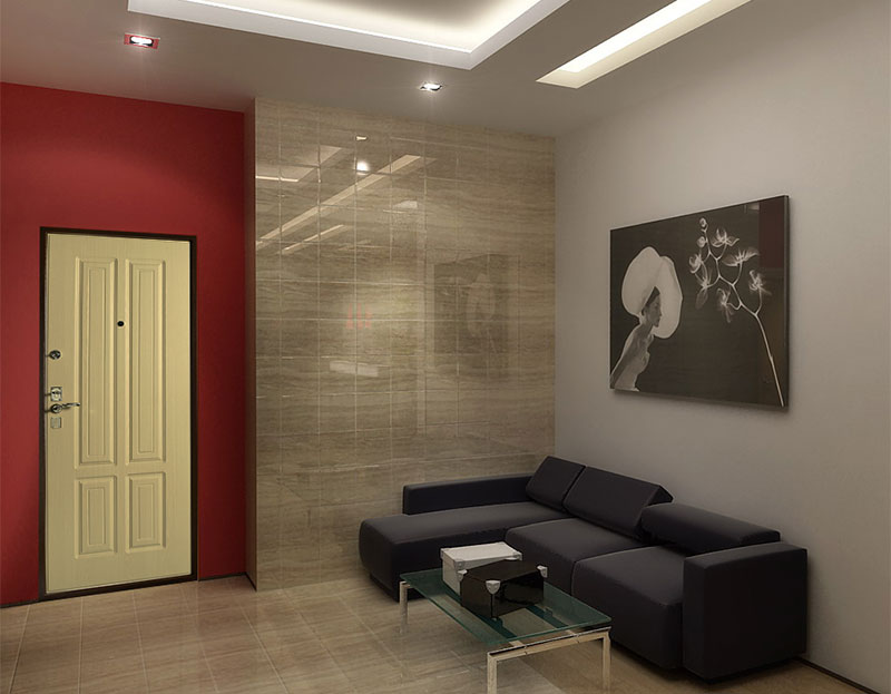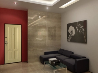 Im Eingangsbereich ist es wichtig, einen Aufbewahrungsort für Oberbekleidung, abnehmbare Schuhe und Taschen zu organisieren. Der Hauptraum kann mit einem Sofa, Sesseln und einem Couchtisch ausgestattet werden.
